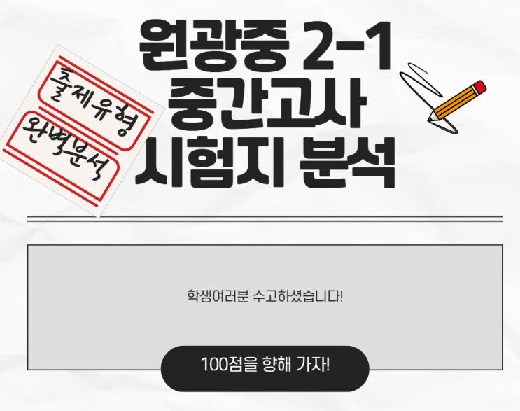안녕하세요! 지혜숲 수학학원입니다. 오늘은 방금 마무리한 2026학년도 1학기 원광중학교 2학년 수학 중간고사를 발 빠르게 분석해 드립니다. 이번 시험을 치른 우리 원광중 학생들 정말 고생 많으셨습니다! 이번 시험은 전반적으로 학교 수업과 교과서에 충실한 문항들로 구성되었지만, 정확한 개념 이해와 계산 능력을 요구하는 문제들이 곳곳에 배치되었습니다. 블로그에 공유하기 좋게 깔끔하게 정리해 드릴게요. 출제경향분석 이번 시험은 선택형 15문항(60점)과 서답형 6문항(40점)으로 구성되었습니다. 서답형 배점이 상당히 높아, 풀이 과정을 논리적으로 적는 연습이 당락을 결정했을 것으로 보입니다. 단원별 문항분포를 살펴보면 크게....... <img src="https://blogthumb.pstatic.net/MjAyNjA0MjFfMTgy/MDAxNzc2NzU5MzkyODU0._gijv94LNspwgfOTD6i9bM_yphNTYnhdL9q2fH4T4Vog.y53H4QY6WiylCEIWuDjz5ADbup9iaTaO5Pu5ihKYKE4g.PNG/image.png?type=s3" />