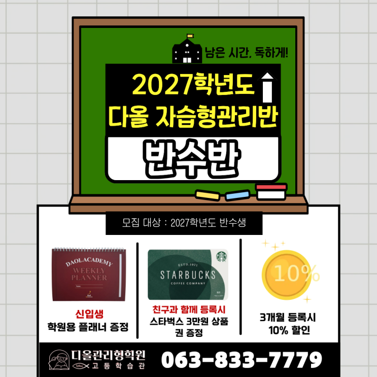 안녕하세요, 다올 자습형 관리반입니다. 반수는 ‘시간’보다 관리와 루틴이 결과를 좌우합니다. 다올 자습형 관리반은 매일 플래너 체크와 피드백, 교사 Q&A를 통해 막히는 부분을 바로 해결하고 학습 흐름을 끊기지 않게 만듭니다. 압도적인 밀착관리 다올은 매 시간 핸드폰 제출과 출결을 확인하며 학생들의 생활패턴을 관리하고 있습니다. 또한 상시 감독 선생님이 계시고, 20분간격 순회 관리가 이루어져 자연스럽게 집중할 수 있는 환경을 만들어줍니다. 또한, 매일 매교시 플래너 체크를 통해 학생들의 학습계획과 공부 방법까지 관리합니다. N수생활의 가장 큰 적은 외부로부터의 유혹과, 잘못된 방법으로 공부하는 것이 가장 큽니다....... <img src="https://blogthumb.pstatic.net/MjAyNjA0MjFfMTkg/MDAxNzc2NzcxMDExMzM4.eg2jB5wdxzoYUKsoEMnhDTO09VZdrvq1skOvyk2vw1gg.ut1y2B5dpGNq29JwWKcjpqp_B0_V5kJwdoD3MTatmU8g.PNG/%C1%A6%B8%F1%C0%BB_%C0%D4%B7%C2%C7%D8%C1%D6%BC%BC%BF%E4._%2830%29.png?type=s3" />
