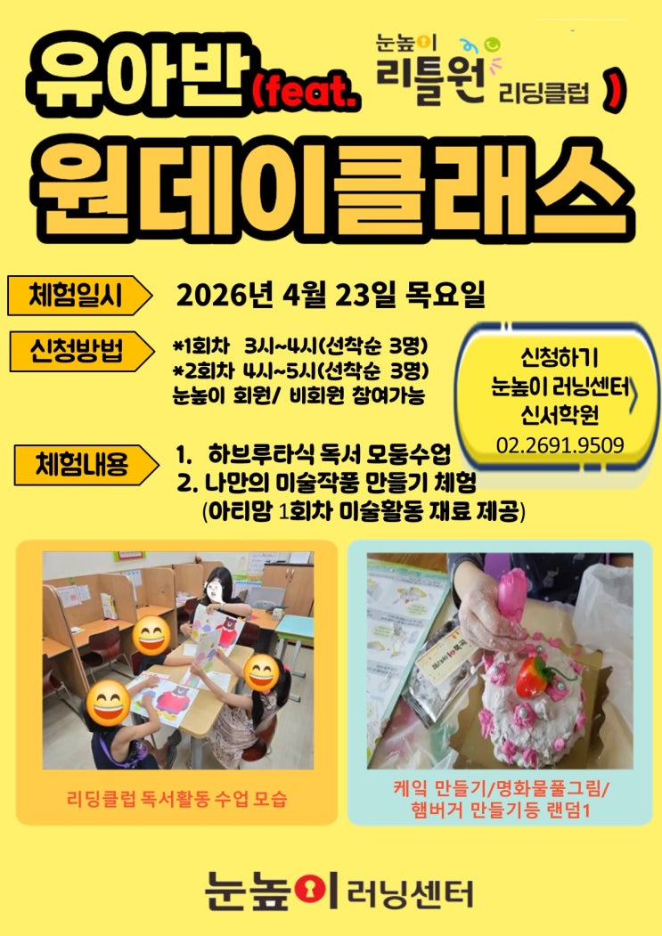 안녕하세요! 눈높이 신서 러닝센터 입니다. 눈높이 만의 특별 유아독서 프로그램 리틀원 리딩클럽 원데이 클래스 무료 수업에 초대합니다. 5세 ~ 7세는 어휘력이 폭발하는 시기로, 이 시기에 책을 접하면 어휘력이 자연스럽게 확장되고 표현력이 크게 향상됩니다! 또, 책을 읽으며 다양한 단어를 듣고 말하게 되면 자신의 감정과 생각을 보다 정확하게 표현할 수 있게 됩니다! 동시에 이야기 속 인물과 상황을 따라가며 상상력을 키우고, 창의적인 사고력 또한 함께 자라납니다! 이야기의 흐름을 이해하고 결말을 추론하는 과정은 아이의 인지 능력을 자극하고 논리적 사고를 발달시키는 데 역시 큰 도움이 됩니다! 이렇게나 중요한 우리 아이 독....... <img src="https://blogthumb.pstatic.net/MjAyNjA0MTVfNDkg/MDAxNzc2MjQ4MDU4Njcw.GUjdxRtIGBoH-ybgnP6Hw1Q2C6lBixk91vU-FxLYhB8g.M6HjqPYL04pqUIPetI-uyuLoeEmhc6Jfx-vVSzyrBEQg.JPEG/11%BF%F9_%B8%AE%B5%F9%C5%AC%B7%B4_%BF%F8%B5%A5%C0%CC_%C5%AC%B7%A1%BD%BA_%BF%CF%BC%BA%BA%BB.jpg?type=s3" />