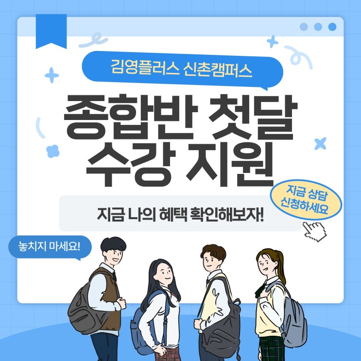 안녕하세요. 김영편입 신촌 플러스 + 성북구,고양,파주,종로.인천.영등포 김영플러스 신촌캠퍼스입니다. 지금이 바로 시작할 타이밍입니다. 김영플러스 신촌캠퍼스 종합반에서는 첫 달 수강료 지원 혜택을 통해 부담을 낮추고, 편입 준비를 빠르게 시작할 수 있도록 돕고 있습니다. 놓치기 쉬운 혜택이지만 지금 확인하면 분명한 차이를 만들 수 있습니다. “지금 나에게 적용되는 혜택은 무엇일까?” 지금 바로 확인하고 시작하세요. 김영플러스 신촌캠퍼스는 단순한 강의 제공이 아닌 합격을 위한 체계적인 시스템을 운영합니다. ✔ STEP 1 진단 현재 수준과 목표 대학을 분석하여 출발점을 설정 ✔ STEP 2 설계 개인별 맞춤 커리큘럼 및 학습....... <img src="https://blogthumb.pstatic.net/MjAyNjA0MjhfMjA5/MDAxNzc3MzMzMjQxMDIx.9uXO_v6XmO6wQP2Txs4gnzfRvUwuAKS2SO4dCHfC2xAg.bz6PUfYLEMKMtziKmTD_-im5mJ8W3HJAO79Z0TlNJvgg.JPEG/1.jpg?type=s3" />