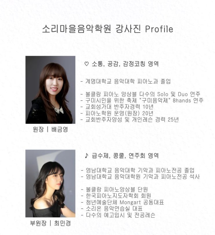 [구미 피아노학원] 소리마을음악학원 강사진 Profile