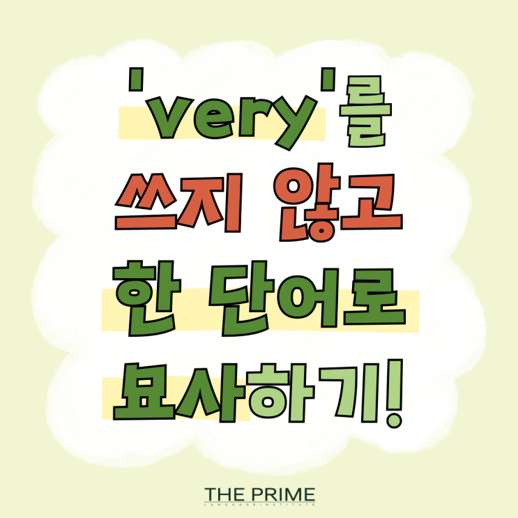 안녕하세요~ 동탄 1:1 영어회화 학원, 더프라임어학원입니다! "You're very beautiful" "I'm very happy" 이처럼 매우, 무척 어떤 걸 강조할 때 'very'를 많이 쓰는데요! very를 붙이지 않고 한 단어로도 표현할 수 있는 단어들이 많이 존재합니다✨ 바로 알아볼까요~? 매우 아름다운 (very beautiful) -> gorgeous, stunning 매우 귀여운 (very cute) -> adorable 매우 굉장한, 훌륭한 (very great) -> terrific 매우 행복한 (very happy) -> delighted, elated, cheerful 매우 재능 있는 (very talented) -> gifted 매우 영리한 (very smart) -> intelligent 매우 흥분한, ....... <img src="https://blogthumb.pstatic.net/MjAyNTA5MjRfMTk0/MDAxNzU4NzA3NTExNjkx.8bHhcLeSkLZceCUl5JqGZipwkacHXvhMwvWP5L3TIocg.WZ2cs5wPwQMdo6HIoibA9t-lvhvz6tO5FbYZ_uxSWtsg.PNG/001.png?type=s3" />