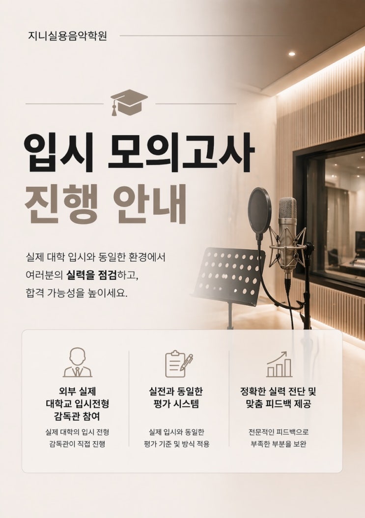 안녕하세요 #동탄 에서 실용음악 입시를 전문으로 지도하고 있는 #동탄실용음악학원 지니실용음악학원 동탄점입니다 이번에 정말 중요한 소식을 전해드리려고 합니다 “실제 대학 입시처럼 진행되는 모의고사”를 진행합니다 보컬,드럼,기타,피아노,미디작곡 그냥 모의고사가 아닙니다 이번 모의고사는 외부 실제 대학교 입시 전형 감독관이 직접 참여합니다 즉, ✔ 실제 입시 기준으로 평가 ✔ 실제 심사 기준 적용 ✔ 실제 시험 분위기 그대로 진행 거의 ‘미리 보는 입시’라고 보시면 됩니다 ⸻ 왜 꼭 필요한가요? 동탄실용음악학원 입시는 실력도 중요하지만 “실전에서 어떻게 하느냐”를 훨씬 중요하게 생각합니다 많은 학....... <img src="https://blogthumb.pstatic.net/MjAyNjA0MjFfMjU2/MDAxNzc2Nzc1NTA5MDQw.TkPR32m9mojvkBEXqDfmU5v6_s6ljB8JsAOFlcoJ5p0g.B3M7-ccV7yE4yeOgnEfAtp9cvRNLBy7o6dtITe6p_nEg.JPEG/9137944F%A3%AD6409%A3%AD44E0%A3%AD8970%A3%ADCCA1F9662FAF.jpg?type=s3" />