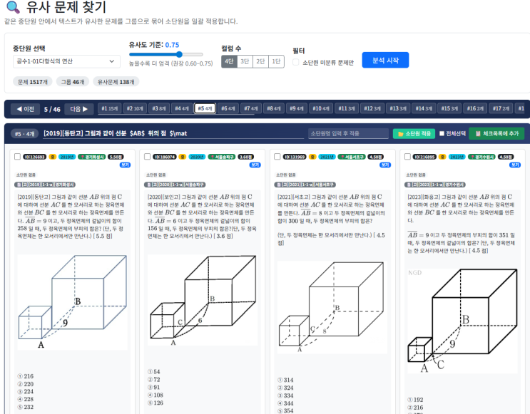 기출문제가 많이 있는데 유사한 유형을 반복해서 풀리는 경우 사용하기 위해서 유사문제 찾기 알고리즘을 만들어서 적용중 입니다. 같은 유형으로 묶어 놓으면 유사한 유형만 집중적으로 풀릴때 가능 합니 <img src="https://blogthumb.pstatic.net/MjAyNjA0MTFfNiAg/MDAxNzc1ODkyNzQyNDYz.gu7YzsvXTTOgX08U1d-5slv_RZvdCCm-n1ri4NaU5Nkg.4XCyx3scWckU7M1RTg0NYb0Ghahce5jQVNCR-hW0IAkg.PNG/image.png?type=s3" />