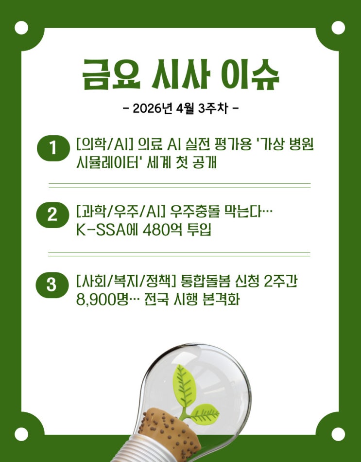 [금요시사이슈] 2026년 4월 3주차 시사 브리핑 기술은 현실이 되고, 제도는 삶을 바꿉니다 안녕하세요, 유패스랩(U-Pass Lab)입니다. 중간고사가 코앞으로 다가온 4월 3주차입니다. 당장 눈앞의 내신 대비에 치이다 보면 시사 이슈를 챙겨볼 여유가 없기 마련이죠. 하지만 바로 이런 시기일수록, 굵직한 헤드라인만 훑기보다는 내 생기부 탐구 스토리로 직결될 수 있는 '진짜 뉴스'를 골라내는 안목이 필요합니다. 이번 주 유패스랩은 의료 현장에 본격적으로 투입된 AI, 우주를 관리하기 시작한 국가 시스템, 그리고 초고령사회에 대응하는 지역사회 돌봄 제도까지, '기술과 제도가 우리 사회에 어떻게 적용되는가'를 보여....... <img src="https://blogthumb.pstatic.net/MjAyNjA0MTdfMjg0/MDAxNzc2MzkxNjEyMjg2.vgw1DnP65yiCewvjM9cKfnXodQlRFv3pQruDrY8vCxwg.Kh6QFVbax6ZDYPvrUPLmLEnxrBreQWQis6-otntAv5Ag.JPEG/%B1%DD%BF%E4%BD%C3%BB%E7%C0%CC%BD%B4-%C7%A5%C1%F6-001_%282%29.jpg?type=s3" />