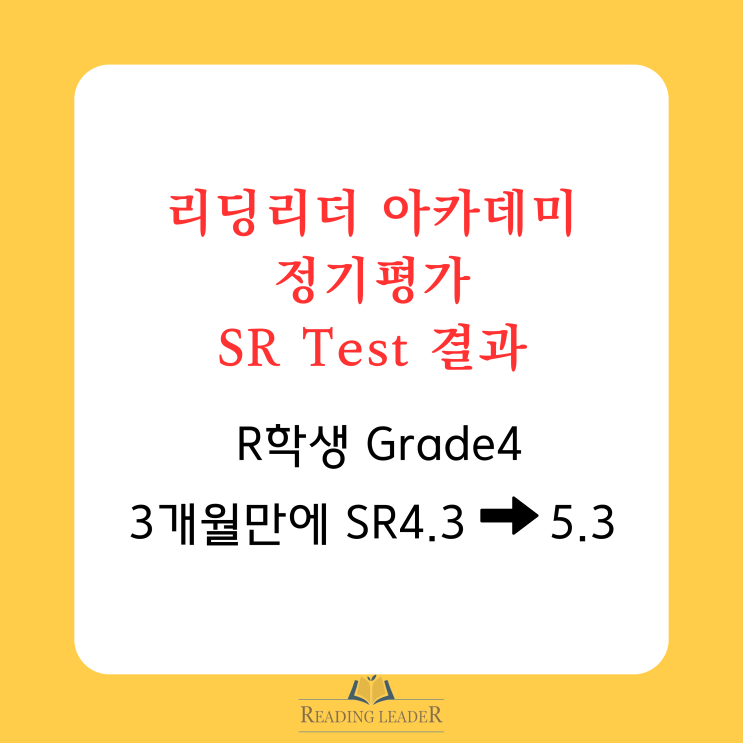 해운대 센텀 초등 원서영어학원 리딩리더 인터내셔널 어학원 르네상스 러닝 SR 테스트 정기평가 결과 3개월만의 변화 한글책은 좋아하는데 영어책은 안 읽어요. SR 점수가 1년 내내 그대로예요... - K어머니 K어머니는 이런 고민을 가지고 리딩리더에 상담을 하러 오셨어요. 그리고 6개월이라는 시간이 지나고 K의 영어 문해력은 어떻게 변화되었을까요? 1년 내내 SR 점수가 제자리였던 K학생은 6개월만에 SR2.8에서 SR5.5로, 무려 2.7 레벨이 올랐어요. 그런데 K학생의 변화는 점수만이 아니랍니다. 원서 읽기의 매력에 푹 빠져서 지금은 오히려 한글책 보다 영어책을 더 많이 읽고 있답니다. 르네상스 SR Test, 어떤 시험인가요? SR(Star Readi....... <img src="https://blogthumb.pstatic.net/MjAyNjA0MTlfMjk3/MDAxNzc2NTg0OTc5NTEw.GtQfalImcHKywRoCi-qfv1TJ2k1SMKs5SBiYHlFjaEIg.0I2zEclPv2aoexsDPEC59gjQJz48N4exBp84Wi7oRXIg.PNG/3.png?type=s3" />