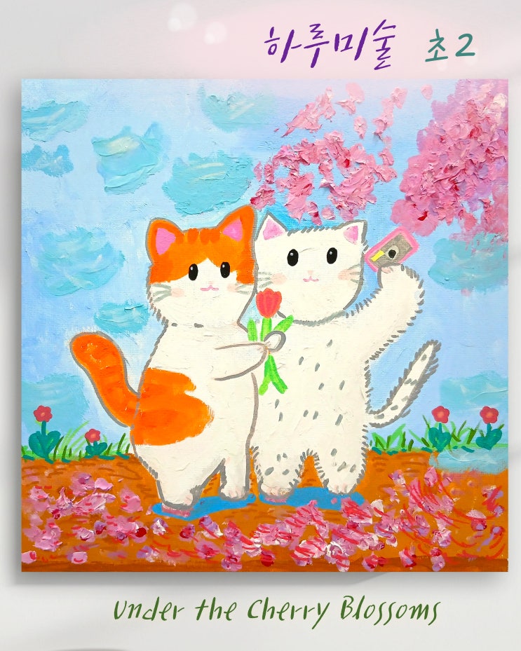 안녕하세요~ 회화, 드로잉 전문 미술학원 하루미술입니다! 오늘은 경원초등학교 2학년 학생의 미술작품을 소개해 드리려고 해요. 작품 속에는 두 마리의 고양이가 벚꽃 아래에서 즐겁게 셀카를 찍는 모습이 담겨 있습니다. 밝고 통통 튀는 아이의 성격이 그대로 전해지는 장면으로, 자연스럽게 미소 짓게 만드는 따뜻한 작품이죠~ 벚꽃 아래의 귀여운 순간 화면 속 고양이들은 서로 가까이 서서 카메라를 향해 포즈를 취하고 있어요. 벚꽃이 흐드러지게 피어 있는 배경과 조화를 이루면서, 밝고 화사한 분위기를 만들어내죠. 학생은 고양이들의 털 질감과 벚꽃의 부드러운 꽃잎, 햇살이 닿는 부분까지 세심하게 관찰하며 색을 겹겹이 쌓아 표....... <img src="https://blogthumb.pstatic.net/MjAyNjA0MjBfODgg/MDAxNzc2NjU5MDEyMjgz.XzQB5RC73Q0WVBF3zz7-bwQRsxMjswMqp2VhlMJGMUAg.fz72sXmFUJrVhEJ9VgrpvL1rU_mCgvr-eHyb2aOQ9OEg.JPEG/%C1%D6%BE%C8%B4%F5%BF%F9%B5%E5_%B9%CC%BC%FA%C7%D0%BF%F8.jpg?type=s3" />