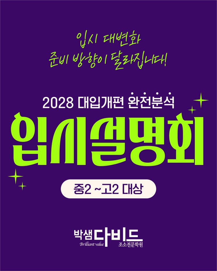 2028학년도 중2~고2 학생 및 학부모를 위한 대학입시 조소과 입시설명회를 박샘다비드조소학원에서 준비했습니다~!! 2028학년도부터 대입의 기준이 크게 달라집니다. 통합수능과 내신 5등급제로 입시의 큰 틀이 바뀌게 됩니다. 이번 입시설명회에서는 달라지는 주요 대학 전형의 흐름부터 학생 수준에 맞춘 실기 준비 전략까지, 학부모님들이 꼭 알아야 할 핵심 내용을 구체적으로 안내드립니다. 조소과 입시설명회 설명회 일시 2026년 5월 9일[토요일] 오후 3시 [선착순예약우선] | 접수방법 | ㆍ전화 접수 : 02-563-2235 ㆍ그리날다 홈페이지 : https://grinalda.net/midae-briefing/parksam-joso/ 현고2,고1,중3대상 학부모님께 꼭 필요한 조....... <img src="https://blogthumb.pstatic.net/MjAyNjA0MTZfMTcw/MDAxNzc2MzMyMjAxNTM0.VLtsrUDzAB0N8tscEFNu1lZnVhoqi5-AQV_7ZT-9u0Ig.9V8a2I0d_1mdGsitWOKsroC8Zbn0EMfB1l6_spW2g8sg.JPEG/01.jpg?type=s3" />