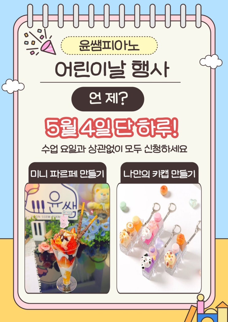 안녕하세요 #가오동피아노 #낭월동피아노 윤쌤피아노입니다! 다가오는 어린이날을 맞아 아이들과 함께 특별한 하루를 보내기 위해 어린이날 이벤트를 준비했어요 윤쌤피아노 어린이날 행사 안내 언제 진행하나요? 5월 4일 단 하루! 수업 요일과 관계없이 모든 친구들이 참여할 수 있도록 준비했어요 윤쌤과 함께 이벤트를 진행할 도우미 친구들도 있지요^^ 이번 어린이날에는 아이들이 좋아할 체험형 활동으로 준비했어요! 첫번째 미니 파르페 만들기 직접 꾸미고 만들어보는 달콤한 나만의 디저트 시간! 두번째 나만의 키캡 만들기 귀엽고 개성 가득한 세상에 하나뿐인 나만의 키캡 만들기 아이들과 또 하....... <img src="https://blogthumb.pstatic.net/MjAyNjA0MjRfMTYw/MDAxNzc2OTk2MzMyMDIz.yVtyMgVzLTaI7ibY03Jk9XHR3dgUETujTyIFLTYnoMMg.yNKq8zF1AHN58AngFIO2mZfOrsx1E48-yLqe_053x3og.JPEG/IMG%A3%DF1547.JPG?type=s3" />