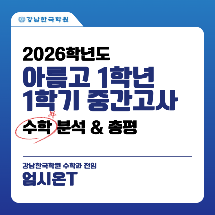 안녕하세요! 세종시 입시전문가그룹 강남한국학원입니다. 아름고등학교 1학년 1학기 수학 중간고사 잘 마치셨나요? ⭐ 아름고1 만점자 배출!! ⭐ 축하합니다 강남한국학원 수학과 엄시온 선생님의 2026년 1학년 1학기 아름고등학교 [수학] 중간고사 기출문제 시험 총평을 말씀드립니다. 최근 시험에서 많은 학생들이 “문제를 몰라서”가 아니라 “시간이 부족해서” 점수를 놓쳤습니다. ① 아름고 1학년 수학 시험 대비 핵심 요약 ✔ 교과서·학교 프린트만으로는 대비가 부족합니다. ✔ 모의고사 기출 + 응용·심화 문제 대비가 필수입니다. ✔ 응용 비중이 높고 신유형이 포함되어, 시간 관리가 핵심입니다. ② 2026년 아름고 고1 1학....... <img src="https://blogthumb.pstatic.net/MjAyNjA0MjVfMTAz/MDAxNzc3MDc3MDA2MDEx.hmJ9K3GgDcos8fcG0O8TgsZ7xv8BT8DlNYoTtEjVsKMg.y1b74Z4rB908dZsLvON7foj-O6U3He_Ee3d_Or1Xtdwg.PNG/%C1%A6%B8%F1%C0%BB_%C0%D4%B7%C2%C7%D8%C1%D6%BC%BC%BF%E4._%2820%29.png?type=s3" />