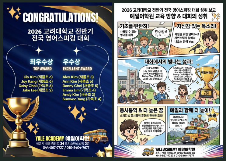 어제 발표된 제2차 영어회화 평가시험 결과, 예일어학원에 정말 기쁜 소식이 도착했습니다! 무려 10명의 학생들이 최우수상과 우수상을 동시에 수상하는 멋진 성과를 이루었습니다! 이 소식을 받는 순간, 저희 선생님들은 환하게 웃을 수 밖에 없었습니다. 우리 학생들, 정말 대단합니다! 이번 결과는 단순한 ‘시험 점수’ 그 이상이라고 생각합니다. 그동안 차곡차곡 쌓아온 노력과 성장의 결과가 눈에 보이는 순간이었기에요. 솔직히 일부 학생들의 발음과 소리 인식 능력에서 보여준 변화는 놀라울 정도였습니다. 그 학생들에게 처음엔 낯설었던 영어 소리가 이제는 자연스럽게 입에서 나오고 있어서요. 이번엔 파닉스 과정을 갓 마친 학....... <img src="https://blogthumb.pstatic.net/MjAyNjA0MjNfMTk1/MDAxNzc2OTEyNTEyOTQw.3rZ9Gf0B_KdJS3_V9crIty3ne6466e7Pv7FHRlyOAVEg.CqYfHEWhfjqMjbLvj75fTqv8E5oquouG_CTlE05MB6Ug.PNG/Screenshot_2026-04-23_at_11.48.28%3FAM.png?type=s3" />