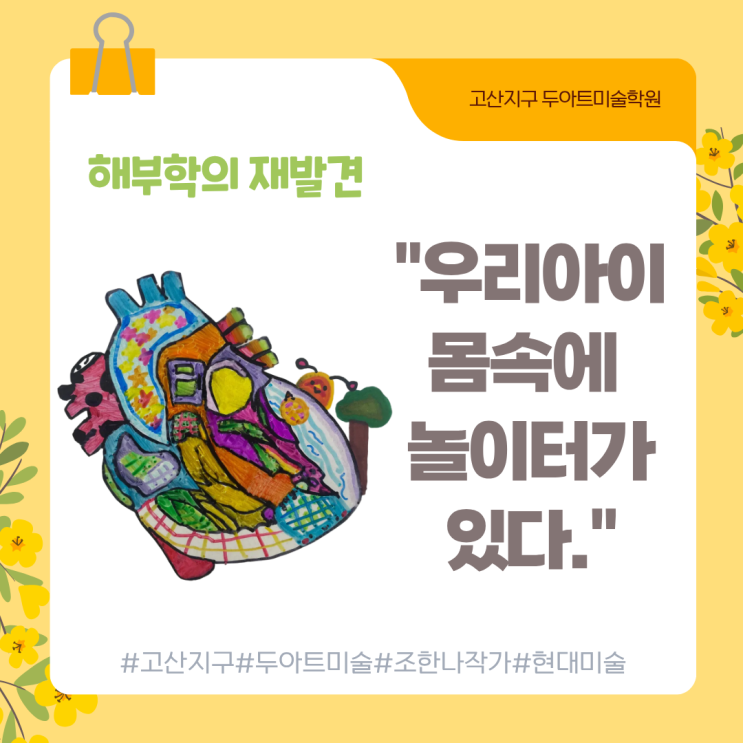 해부학이 무섭다던 7세 사랑이는 어떻게 '우주' 를 그리게 됐을까? 안녕하세요, 의정부 고산지구 산곡동 생각하는 힘을 키우는 두아트미술교육원 입니다. 최근 독일 슈투트가르트를 기반으로 세계 갤러리에서 사랑받고 있는 신진 작가 조한나를 아시나요? 우리 두아트 친구들도 작가의 시선을 빌려 우리 몸속의 아름다움을 탐구하는 특별한 시간을 가졌습니다. 처음 해부학 도판을 보여주었을 때, "선생님 무서워요!", "으악, 징그러워요!"라며 눈을 가리던 사랑이의 모습이 선합니다. "선생님 무서워요!" "으악, 징그러워요!" 하지만 조한나 작가가 인체의 내부를 식물의 뿌리나 대지의 풍경....... <img src="https://blogthumb.pstatic.net/MjAyNjA0MTlfNiAg/MDAxNzc2NjA5Nzk0NDE2.aSGor3F8alqzMgS9PZDmr81nvD8VoY-GoPqCQzgQtMMg.9X-ifajYcs265p_AZ30hqRg8BAV3DZfe69T96xRK_S0g.PNG/%C1%A6%B8%F1%C0%BB_%C0%D4%B7%C2%C7%D8%C1%D6%BC%BC%BF%E4._%2838%29.png?type=s3" />