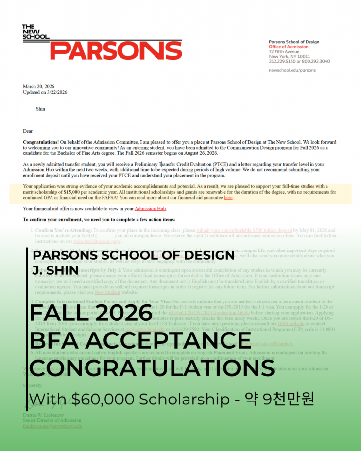 [미국미술유학/뉴욕미술유학] 파슨스 전원 합격, 이번에는 파슨스편입 장학금 $60,000!