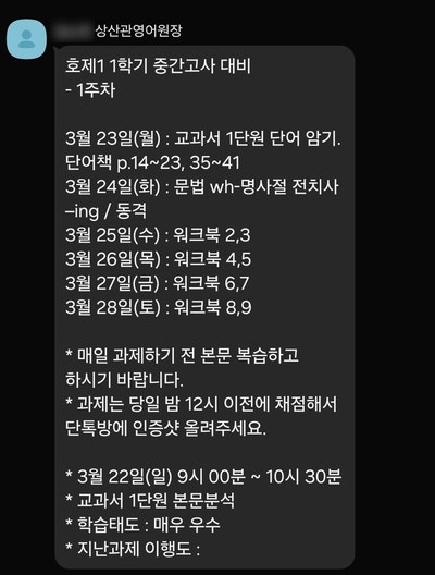 안녕하세요 탐스입니다! 고등학교 중간고사를 대비해 탐스학원에서는 어떤 체계로 학습을 진행하고 있을까요? 아래에서 자세히 살펴보겠습니다~! 고등학교 중간고사를 대비하여, 탐스학원은 주간 단위로 세분화된 학습 계획을 기반으로 수업합니다. 영어 선생님은 매주 학습 범위와 목표를 구체적으로 안내하여, 학생들이 자신의 학습 진행 상황을 명확하게 이해도록 돕습니다! 본문 학습에 앞서 어휘 점검으로 시작됩니다. 이를 통해 해당 단원에서 다룰 내용을 미리 예측하고, 자연스럽게 배경지식을 형성합니다. 수업은 워크북과 본문 예상문제 풀이로 진행되며, 일주일 동안 균형 있게 학습이 이루어지도록 설계되어 있습니다. 또한 학습 효....... <img src="https://blogthumb.pstatic.net/MjAyNjA0MjZfMjI3/MDAxNzc3MTc4MjI1NTk5.MlRqcZWEucMtspDhF0-A1WXRuJ_fisXcH_anb1AabjEg.RXVIHuyH2KLuKyGYvJcVTxtPVsJBEF1SndAIwAf-jZwg.JPEG/%C8%A3%C1%A61.jpg?type=s3" />