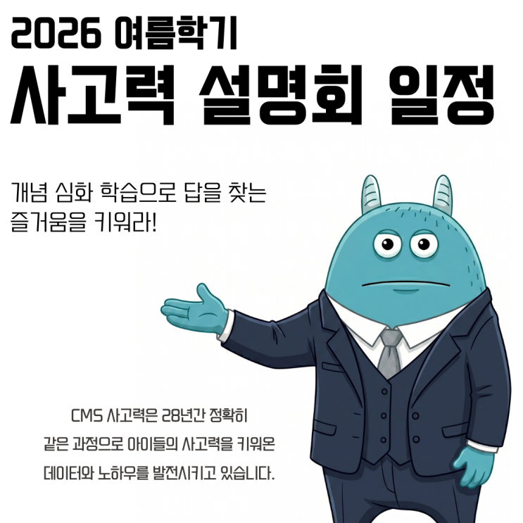 안녕하세요, CMS 목동 사고력수학관 목동쌤입니다. 따스한 봄볕이 완연한 4월 말입니다. 새 학기의 설렘과 긴장감이 어느덧 지나가고, 이제는 우리 아이들의 학습 습관을 점검하며 다음 도약을 준비해야 할 때입니다. 6월에 시작될 여름학기는 상반기 학습을 탄탄하게 다지고 하반기 실력을 결정짓는 매우 중요한 전환점입니다. 이에 CMS 목동에서는 우리 아이들의 사고력을 한 단계 업그레이드하고 싶은 학부모님들을 모시고, 세 가지 맞춤형 주제로 여름학기 대비 사고력 설명회를 개최합니다. CMS 목동 여름학기 설명회 상세 일정 모든 설명회는 오전 11시에 진행되며, 심도 있는 질의응답을 위해 선착순 소그룹으로 마감될 예정입니다. [1회....... <img src="https://blogthumb.pstatic.net/MjAyNjA0MjNfNDEg/MDAxNzc2OTM4NTY2Njk2.bVuc7HUkTzpcHqfNL4DEqwXE0WWjPIFmdzZvbyLb_1Ig.fpHNT3Nfi922t9xdGfR9Ib3X9VEIrw1myT5GJXNewHIg.PNG/%BF%A9%B8%A7%C7%D0%B1%E2_%BC%B3%B8%ED%C8%B8.png?type=s3" />