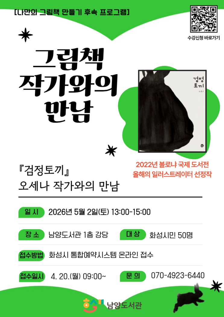 2026년 5월 화성시립남양도서관 주요행사 안내 남양도서관에서 5월에 진행될 다양한 행사에 많은 관심과 참여 부탁드립니다! ► 자세한 사항은 홈페이지 공지사항 및 화성시 통합예약시스템 상세페이지를 확인해주세요. ► 도서관 사정에 따라 행사 일정 및 내용은 변동될 수 있습니다. 네이버 예약(상단 사진 클릭↑) 또는 010-7382-7137 문자 <img src="https://blogthumb.pstatic.net/MjAyNjA0MjFfOCAg/MDAxNzc2NzY4NTY3ODM5.ZGdIIFs136GRBpD6mGxYYRrWGB7MJjVyC0XT_jKbyqYg.DEeA2qTjqgaABKq7tbo4Qb98r-c9uc5yqzBktJGlopsg.PNG/54821_1_20260417154617004.png?type=s3" />