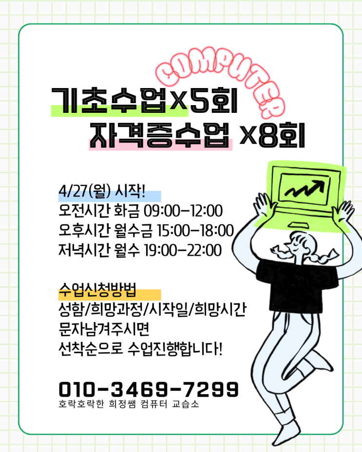안녕하세요? 호락호락한 희정쌤 컴퓨터 교습소입니다! 다가오는 5월 가정의 달 아래와 같이 컴퓨터 교육생을 모집합니다~ 소그룹 컴퓨터 과외 수업을 받을 수 있는 우리동네 교습소에서 컴퓨터 공부 시작해보세요! 많은 학부모님들과 컴퓨터 공부를 시작하시려는 분들의 참여와 문의 바랍니다! 감사합니다^^ <img src="https://blogthumb.pstatic.net/MjAyNjA0MjNfOTYg/MDAxNzc2ODc2OTYwNDcz.rDySDlRGw9gUGHmauQ7Xfjky475TfLNQubMfLI-K0oEg.ZmH5mwVwZAuLFwDnJ9rLGafOt7TX0mGe7xwVufgI0S8g.PNG/6.png?type=s3" />