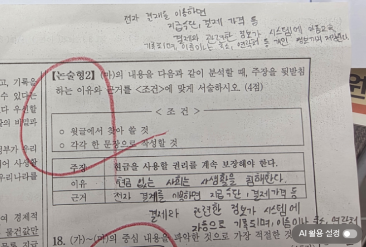 대지중2학년 국어 중간지필 완벽 적중 - 안선생 국어논술 - [대지중2 국어] 소름 돋는 중간고사 완벽 적중! 기말고사 100점! 지금이 골든타임입니다! 이번 대지중학교 2학년 1학기 국어 중간고사 우리 학원의 자체 내신 대비 문제집으로 훈련한 학생들은 시험지를 펼치자마자 확신에 찬 미소를 지을 수 있었습니다. 실제 시험 문제와 토씨 하나 틀리지 않고 100% 일치한 놀라운 적중 신화, 그 구체적인 증거를 직접 확인하세요! 내신 대비 문제집의 적중률이 매우 높았으며, 특히 특정 문항의 <보기> 지문과 논술형(서술형) 문제의 요구 조건까지 100% 일치하는 완벽 적중 사례들이 다수 발견되었습니다. 상세한 문항별 적중 분석 결과는 다....... <img src="https://blogthumb.pstatic.net/MjAyNjA0MjVfNDQg/MDAxNzc3MDc3MjY4NzQ3.DSkCIOPHWsm9FBmGdMBUjblzhvOcPJk4bM-VuUvSc1Mg.Oj5Pk8xDHJ84YOYQ1eqDFOPkUNsxWcygDg28tKx3do0g.PNG/image.png?type=s3" />