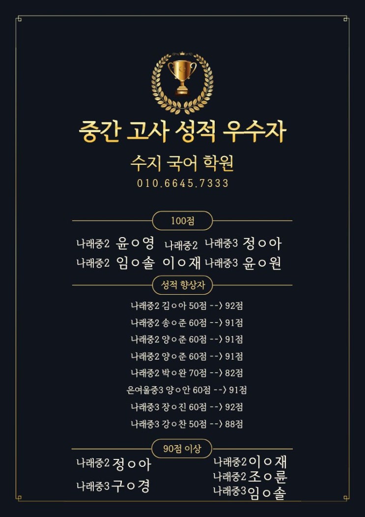 안녕하세요 수지 국어 학원입니다. 2026년 처음 보는 중간고사였는데요. 3월부터 준비한 시험 대비 기간을 열심히 준비해 준 우리 친구들 정말 고생 많았습니다. 고생한 만큼 점수가 나와 주어서 얼마나 기쁜지 모릅니다. 쉬웠다고 하는 친구들도 있고 어려웠다고 하는 친구들도 있습니다. 나래중 같은 경우에 쉽다고 느꼈을 수 있지만 그만큼 노력했기에 쉽다고 저는 늘 생각합니다. 1학기 마지막 기말도 열심히 준비해 보겠습니다.^^ #김포국어 #구래동전과목 #구래동국어 #은여울중 #한가람중 #나래중 #솔터고 #양곡고 #구래동초등전과목 #구래동논술 #나래중국어 #솔터고국어 #양곡고국어 #한가람중국어 #솔터초 #솔터초국어 #솔터초전과목 #....... <img src="https://blogthumb.pstatic.net/MjAyNjA0MjhfMTQ5/MDAxNzc3MzUzNzk5MTM1.13B3Mk1nJSTL6hlrYfk7D4W1KOfzjB3DhEWGKHS0MTIg.acoLaEicdLhT2zt5KJ0G7zSyrzsLot3wnwQG1RnWZ74g.JPEG/%C1%A6%B8%F1%C0%BB_%C0%D4%B7%C2%C7%D8%C1%D6%BC%BC%BF%E4._%284%29.jpg?type=s3" />