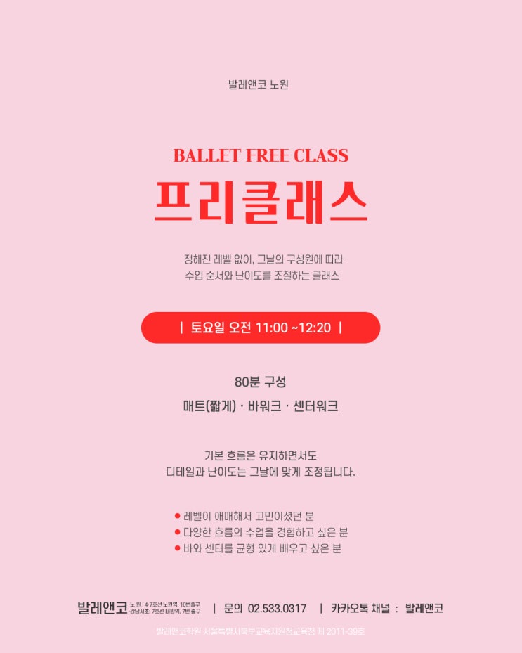 프리클래스 Free Class 정해진 레벨 없이, 그날의 구성원에 따라 수업 순서와 난이도를 조절하는 취미발레 클래스입니다 ✔ 클래스 특징 레벨 1 ~ 3 구분 없이 참여하신 회원님들에 맞춰 순서를 유연하게 진행합니다. “오늘은 조금 더 기본을” “오늘은 조금 더 확장해서” 몸 상태와 실력에 맞게 자연스럽게 이어가는 수업이에요. ⏰ 수업 구성 (80분) ✔ 매트워크 (짧고 집중적으로) ✔ 바워크 ✔ 센터워크 기본 흐름은 유지하면서도 디테일과 난이도는 그날에 맞게 조정됩니다. ✨ 이런 분들께 추천해요 ✔ 레벨이 애매해서 고민이셨던 분 ✔ 다양한 흐름의 수업을 경험하고 싶은 분 ✔ 바와 센터를 균형 있게 배우고 싶....... <img src="https://blogthumb.pstatic.net/MjAyNjA0MzBfMjky/MDAxNzc3NTIxMjMxNzEz._9K3cugNawsMkuWQtywNoFW1cGOMMPApULscPq-ICV0g.iEoHpNpTiwldig3R2LpvreA4qIb6JdDVcKzNbA1qiAUg.JPEG/%B3%EB%BF%F8%C7%C1%B8%AE%C5%AC%B7%A1%BD%BA.jpg?type=s3" />