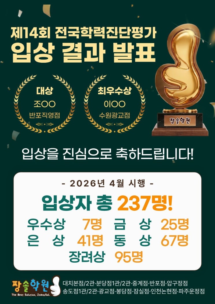 제14회 짱솔학원 전국학력진단평가 입상 결과 발표