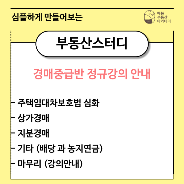 경매입문반은 지난 목요일에 종강하였습니다. 5주동안 낮에는 일하시고 저녁에는 공부하러 오신 수강생분들께 고생하셨고 감사하다는 말 전해드리고 싶습니다. 이어서 5월에는 경매중급반을 진행할 예정입니다. 오늘은 중급반에서 다룰 강의에 대해서 간단하게 안내해드리겠습니다. 주택임대차보호법 심화 경매중급반에서는 입문반에서 다루었던 내용과 더불어 조금 더 심화된 이론을 다룰예정입니다. 기초반에서 말씀드렸던 내용들로도 충분히 권리분석이 복잡하지 않은 아파트경매사건 같은 물건들은 분석이 가능합니다. 경매입문반에서 기본적인 경매용어와 경매절차 그리고 말소기준권리와 「주택임대차보호법」(이하, 「주임법」)에서 임차....... <img src="https://blogthumb.pstatic.net/MjAyNjA0MThfMTU3/MDAxNzc2NDY3NDU0MzI5.Arabk0XY4br75-87bLdjKgKLmd2I9fUul4o85FY3BfMg.SbcnFSl_qp4CW0NivXz3vhL95Y75Wh0xGhH8aRtZzKgg.PNG/%C7%D8%BA%BD%BA%ED%B7%CE%B1%D7_%BA%B9%BB%E7%BA%BB-001.png?type=s3" />