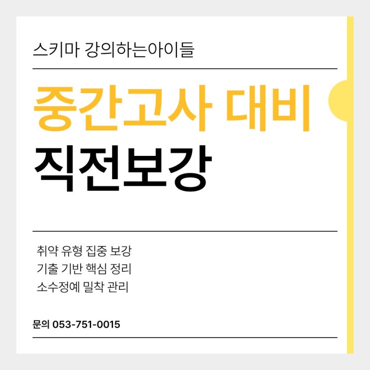 4월 19일 아침 7시, 중간고사 직전 보강이 시작되었습니다. (직전보강 시간은 반별로 상이합니다.) 마지막까지 흐트러지지 않도록, 학생 한 명 한 명 끝까지 관리합니다. 취약 유형 보완부터 기출 핵심 정리, 그리고 시험 직전 밀착 관리까지. 보강은 단순한 수업이 아니라 결과를 만드는 ‘관리’입니다. 아이들이 끝까지 집중할 수 있는 이유, 바로 이 차이입니다. 학부모님들이 안심하실 수 있도록 마지막 순간까지 최선을 다하겠습니다. 강의하는아이들 범어캠퍼스 프라이빗 학원설명회 강의하는아이들 학부모님 설명회 https://naver.me/FPnkZq6E <img src="https://blogthumb.pstatic.net/MjAyNjA0MThfMTY4/MDAxNzc2NDkzODc1MDM0.fT4GQ-9UevgsUeRV8nVcHV1Yxe7PO4EV6l_mUwUpTxwg.zsAp8moBS3TQEE8HBPxuFO3--jELkY_Gr2R2u6p8BPEg.JPEG/%C1%A6%B8%F1%C0%BB_%C0%D4%B7%C2%C7%D8%C1%D6%BC%BC%BF%E4._%281%29.jpg?type=s3" />