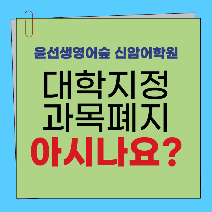 안녕하세요, 대구윤선생영어숲 신암 어학원입니다! 4월의 따뜻한 봄바람처럼 새로운 입시의 변화가 교육계를 가득 채우고 있습니다. 오늘은 우리 학부모님들께서 궁금해 하시는 '수능 지정과목 폐지' 에 대해 정보를 공유하도록 하겠습니다! 먼저 수능시험 지정과목이라는 것을 알고 계시나요? 지정과목이라는 것은 특정 대학과 학과에 지원을 하기 위해서 수능시험에서 응시를 해야 하는 필수과목을 지정하는 것입니다! 보통은 이과 계열 학과를 지원하기 위해서는 수학에서 미적분이나 기하 등을 선택해야 하거나 과학탐구 영역을 선택해서 꼭 응시를 해야 하는 것입니다! 이러한 지정과목으로 인해서 문과계열 학과를 공부해서 수학....... <img src="https://blogthumb.pstatic.net/MjAyNjA0MjBfNDEg/MDAxNzc2NjkwNTg5NzE2.IeicZRfR5d10w61Gpwo-g9KK262HeaVggpVPjGcK4Kog.HOvQ1bamqkQ0mkRYcU0qNuOJztyi3Y8A-2_yLx_gROog.PNG/%B4%EB%C7%D0%C1%F6%C1%A4%B0%FA%B8%F1%C6%F3%C1%F6_%2820%29.png?type=s3" />