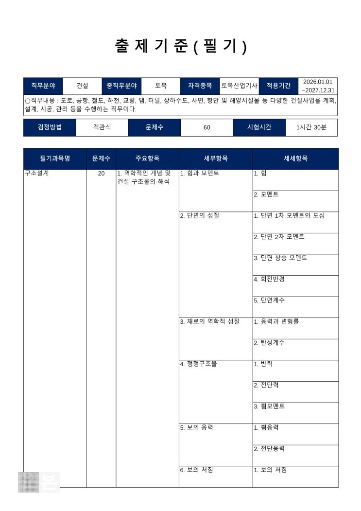국가 기술 자격증으로 토목산업기사 자격증이 있는데 출제기준 적용기간이 2026~2027년까지라고 합니다. 꼭 확인하시고 준비하시기 바랍니다. <img src="https://blogthumb.pstatic.net/MjAyNjA0MjFfNDEg/MDAxNzc2NzMwODA2Nzc4.MzQ0Ug9yxwCmrp8HXgvTHWNEjXdnoaFBqCdWEMHbiWEg.bgKZ71bRQWWORb4vfNqODeGjQUWlUccfnOIJT5jq7bUg.JPEG/2-20260421091517375_1.jpg?type=s3" />