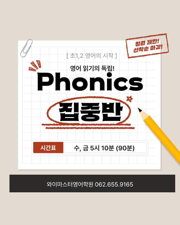 날이 많이 따뜻해지고 아이들은 새학기에 적응했을 듯 싶습니다! 그리고 초등학교 새학기 적응 끝나고 영어를 시작하고 싶은 친구들을 위해 파닉스 단모음 말고, 이중자음, 장모음 오픈 시작합니다 파닉스를 공부하는 이유는 바로 읽고 쓰기의 영어독립입니다. 일단 아이들이 모르는 단어도 읽고 쓰고 자유로워지면 영어가 정말 재미있고 즐겁게 공부할 수 있습니다! 단순히 단어를 외우고 읽는 것이 아니라 여러 단어노출을 통해 아이 스스로 영어를 읽고 쓰게 하고 싶다면 기본기 튼튼하게 파닉스 공부 필요함을 강력하게 말씀드리고 싶은 일인 입니다!! 한 클레스 오픈이고, 정원 5명 이니, 빠른 문의 주시면 감사하겠습니다 와이마스터 062.6....... <img src="https://blogthumb.pstatic.net/MjAyNjA0MDdfMTgy/MDAxNzc1NTM1NzI2NjU0.loGhtukM_Fzm89GNdP4cW4So6VV3J2r11bPJK8VbbW0g.08nbtrPUTrdYkv2tbxsagtSxoeAdEw7KVxCv3BuxEpAg.PNG/%C1%A6%B8%F1%C0%BB_%C0%D4%B7%C2%C7%D8%C1%D6%BC%BC%BF%E4._%2818%29.png?type=s3" />