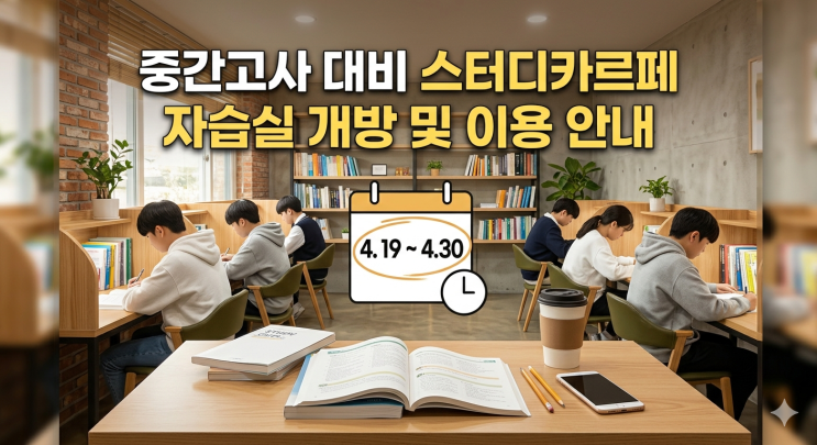 안녕하세요, 봉선동 수학의 가장 확실한 멘토, 카르페수학 원장입니다. 중간고사 기간이 다가오면서 학생들이 집중해서 공부할 수 있는 환경이 무엇보다 중요해지고 있습니다. 이에 카르페수학학원에서는 중간고사 대비 자습실 「스터디 카르페」 를 전격 개방합니다. 이번 자습실 개방은 기존 수강생뿐만 아니라 비수강생도 신청 후 이용 가능하도록 운영하여, 더 많은 학생들이 안정적인 학습 환경 속에서 시험 준비를 할 수 있도록 돕고자 합니다. 운영 기간 2026년 4월 19일(일) ~ 4월 30일(목) ⏰ 이용 시간 평일 : 14:00 ~ 22:00 주말(토·일) : 10:00 ~ 19:00 ✔ 이용 대상 카르페수학학원 수강생 비수강생 (사전 신청 필수) ✔ 이용....... <img src="https://blogthumb.pstatic.net/MjAyNjA0MTZfMTA3/MDAxNzc2MzM2OTI2OTc3.S-eQsLEDHiv4QS4f_wGB4Rnqo1oqkZSuGGad0_L0Izkg.nePB184qOc7wRacXoeIyOoWQOCk05HGKxng8J7pUjBEg.PNG/Gemini_Generated_Image_ebiqjjebiqjjebiq.png?type=s3" />