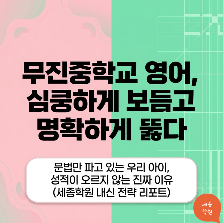 안녕하세요! 무진중학교 학생들의 학습을 오랫동안 함께 해 온 백운동 영어학원 세종학원입니다. 중간고사·기말고사를 앞두고 학부모님들께서 가장 먼저 걱정하시는 것이 문법입니다. 그런데 실제 무진중학교 영어 시험지를 분석해 보면, 문법은 기본 중의 기본일 뿐이고 진짜 승부처는 다른 곳에 있습니다. 매년 비슷한 유형으로 반복되는 시험임에도 불구하고 성적이 오르지 않는 학생들의 공통점이 있습니다. 바로 '전략 없이 공부한다'는 점입니다. 오늘은 무진중학교 영어 내신을 준비하는 학생들이 문법 외에 반드시 챙겨야 할 핵심 포인트와 세종학원만의 내신 관리 방법을 소개해 드리겠습니다. 내신준비 문법외 핵심포인트 1........ <img src="https://blogthumb.pstatic.net/MjAyNjA0MTdfNzMg/MDAxNzc2MzU2NzY3NDY0.rN6Qtq0QT-Xa5X6R68TGXdENF-SPTuaso5Hst8hyjbMg.4dzj7XA5omnkENBzc7qlRM1D81HrQcE3ORvF8kdCZ8Qg.PNG/Gemini_Generated_Image_ywf3u0ywf3u0ywf3.png?type=s3" />