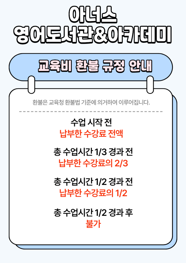 아너스 영어도서관&아카데미에서 교육비 환불 규정 관련하여 안내말씀드립니다.