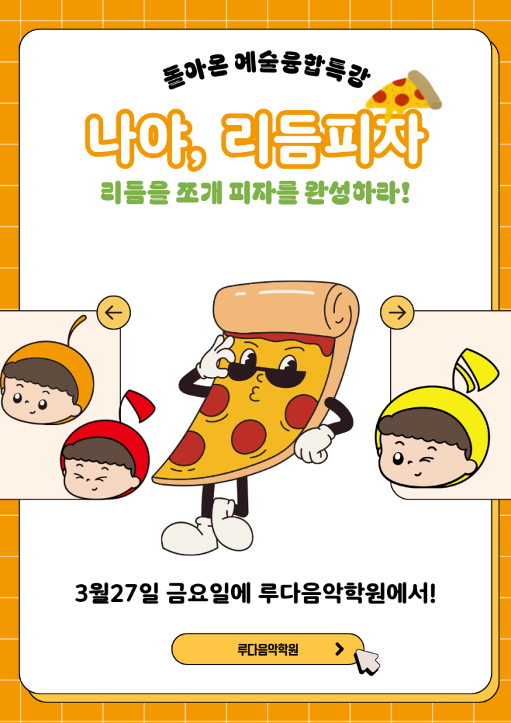 안녕하세요. 대전내동피아노학원 루다음악학원입니다 ෆ˙ ᵕ ˙ෆ 벚꽃잎이 흩날리는 ~~ 봄의 날씨 만끽중이신가요~~? 루다쌤도 벚꽃이 다 떨어지기 전에! 호다닥 봄의 향기를 느끼고 왔답니다 싱그러운 봄의 향기 가득 풀충전했으니!!! 이 싱그러운 에너지가 루둥이들에게 닿기를 ~~ 오늘의 포스팅은! 오로지 대전내동피아노학원 루다음악학원에서만 체험할 수 있는 !! ✌ 예술융합특강 ✌ 대전내동피아노학원 루다음악학원 루둥이들이 가장 좋아하고 기다리는 특강이 잠시 정비의 시간을 마치고 돌아왔답니다 !! 나야, 리듬피자! 박자도 쪼개진다는거 아세요?? 피자 1판에는 총 8조....... <img src="https://blogthumb.pstatic.net/MjAyNjA0MDhfMjY5/MDAxNzc1NjIwNDg4NzA3.aABGbYYgpMGrzm7xXUlqpvLHaqqVmj2OSlBLxZ_yotYg.Cj94VyrNiQ8X2tYVanZi21AsCnN6z8j1hTvZEEAZ7Kog.PNG/IMG%A3%DF2322.PNG?type=s3" />