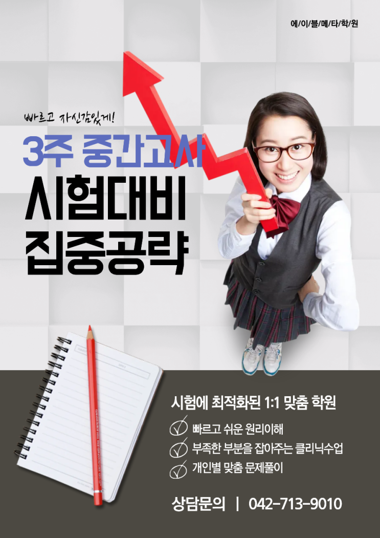 에이블메타 학원에서는 어떻게 시험 대비를 할까요? 중간고사 3주 완성 시험대비!!!! 중학교 내신 대비 각 학교별(지족중, 외삼중, 어은중) 교과서를 바탕으로 어휘 (Lesson 1,2과) 전체 단어 시험/ 영영풀이 대화문 (지문 해석 및 암기, 문제풀이) 문법 (시험 대비 문법 완벽 이해 및 문제 풀이) 본문(전체 지문 해석, 암기 및 문법 정리 후 문제 풀이) 평가문제집/100발100중/족보닷컴 문제로 시험 문제 풀이 고등학교 내신 대비 각 학교별(지족고) 교과서, 모의고사, 올림포스 시험 범위를 바탕으로 교과서 (Lesson 1,2과), 모의고사 어휘 전체 단어 시험/ 영영풀이 문법 (교과서, 모의고사 연도별, 문법 완벽 이해 및 문제 풀....... <img src="https://blogthumb.pstatic.net/MjAyNjA0MTNfMjQy/MDAxNzc2MDU4MjY5MDQx.ewIw7SN_tvkKXWL0ZtK8JViRDeTkxPX70LSssuWbbr0g.YT-j2e2HPQJlXDs_O6aBRezyiNdRdXMsFgmzBGWjY2Eg.PNG/%B1%A4%B0%ED_%282%29.png?type=s3" />