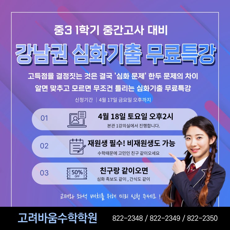 유성중 수학학원 : 우리 아이 전교권 굳히기, 4/18(토) 딱 2시간으로 끝낸다.