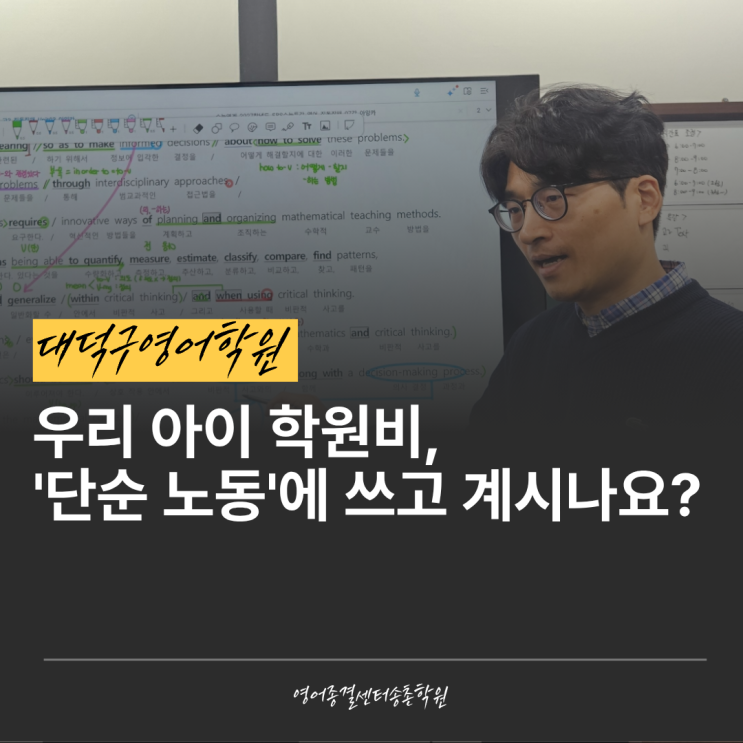 안녕하세요. 대덕구영어학원 영어종결센터 송촌학원입니다. 매달 정성껏 결제하시는 학원비가 혹시 우리 아이의 '단순 노동'에 쓰이고 있지는 않은지 냉정하게 짚어봐야 합니다. 귀한 학습 시간이 단어 재시험을 치르는 지지부진한 과정에만 머물고 있다면, 그것은 공부가 아니라 시간 낭비에 불과하기 때문이지요. 실제로 단어 10개를 외우는 것조차 고통스러워하며 좌절하던 학생이 있었어요. 하지만 지금 그 학생은 매일 200개의 누적 테스트를 당당히 통과하며 누구보다 밝은 표정으로 학원 문을 나섭니다. 이러한 반전은 아이의 의지가 아니라 오직 '시스템'의 차이에서 시작된답니다. ▶ 단어 암기, 의지가 아니라 &#x....... <img src="https://blogthumb.pstatic.net/MjAyNjA0MDdfMTI2/MDAxNzc1NTM2MDIwNTI1.LVSHpK2jsQbyL11Up-dlLoFLSdGx1KUz89DWZstSK9Qg.J7tYP8zL2SThP9K3bWquDc-d45w3JiyncBblBiJVzNMg.PNG/1.png?type=s3" />