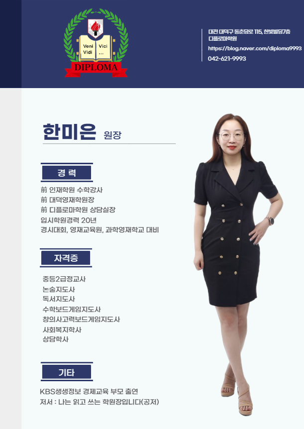 송촌동에서 중·고등 수학학원을 찾다 보면 결국 가장 중요하게 보게 되는 것은 하나입니다. 이 학원에서 누가 직접 학생을 보고 누가 책임 있게 이끌어 가는가 하는 점입니다. 디플로마학원은 오랜 시간 교육 현장을 지켜온 원장과 부원장이 함께 학생들을 만나고, 수업과 상담, 관리까지 꼼꼼하게 챙기고 있습니다. 오늘은 디플로마학원을 이끌고 있는 한미은 원장님과 윤영진 부원장님을 소개해 드리겠습니다. 한미은 원장님은 오랜 입시학원 경력을 바탕으로 학생과 학부모를 세심하게 살피는 분입니다. 수학 강사 경력은 물론, 학원 운영과 상담 경험까지 함께 갖추고 있어 학생의 현재 실력만 보는 것이 아니라 어디에서 막히는지, 어떤 방....... <img src="https://blogthumb.pstatic.net/MjAyNjA0MDhfMzAw/MDAxNzc1NjUyMzU3NDkw.Nl77_SRXtMgeCp8uyc7KeDoeSvXeEsF9ZQidy1Lh9x8g.CVGareLgbhRbk844S3OmMm5H1WMzafGEYMWC0Q7lLZYg.PNG/KakaoTalk_20260402_220141979.png?type=s3" />