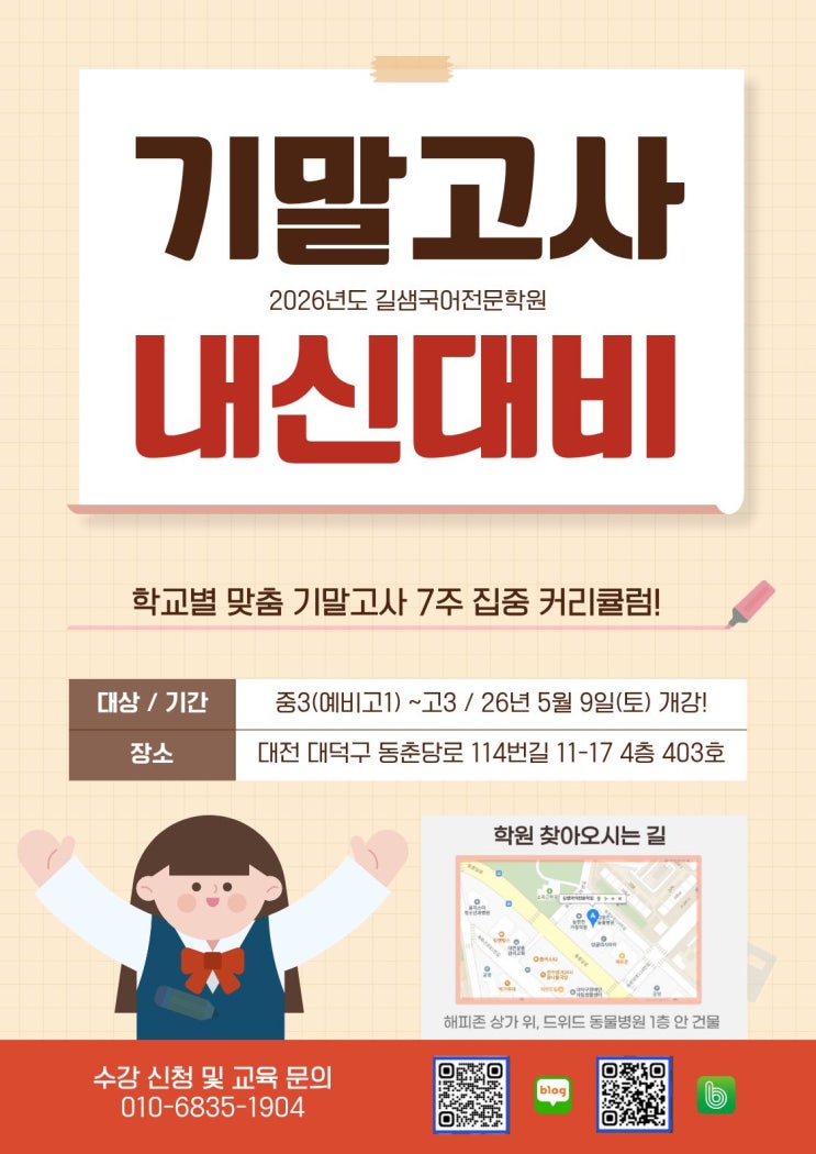 가장 완벽한 마무리를 위해, 길샘 국어가 다시 움직입니다. 5월 9일(토), 1학기 성적을 결정지을 밀도 높은 내신 대비가 시작됩니다. "국어의 길을 알면, 결과는 따라옵니다." ○ 본격 내신 모드 | 5월 9일(토) 개강 ○ 몰입의 시간 | 실전력을 극대화하는 7주 집중 커리큘럼 ○ 길샘만의 전략 | 정교한 기출 패턴 분석 및 고난도 심화 훈련 철저하게 분석하고, 집요하게 관리하겠습니다. 이번 기말고사, 길샘 국어와 함께 흔들리지 않는 실력을 완성하십시오. ■ 수강 및 교육 문의 : 010-6835-1904 ■ 위치: 대전시 대덕구 동춘당로 114번길 11-17 4층 403호 (해피존 상가 위, 드위드 동물병원 1층 안 건물) #국어학원 #대전국어 #대....... <img src="https://blogthumb.pstatic.net/MjAyNjA0MThfMjc4/MDAxNzc2NTAyMDYzNjgy.yhtuqD9e57sWUt_auiewA16jYLem_aRsb2unH_UOnMIg.yTJzXCxR8YcM0_p-bxaZ8E5jKnPbr0QoAK3T4OHKNMIg.JPEG/%B1%E2%B8%BB%B0%ED%BB%E7%B3%BB%BD%C5%B4%EB%BA%F1%BE%C8%B3%BB_%282%29.jpg?type=s3" />
