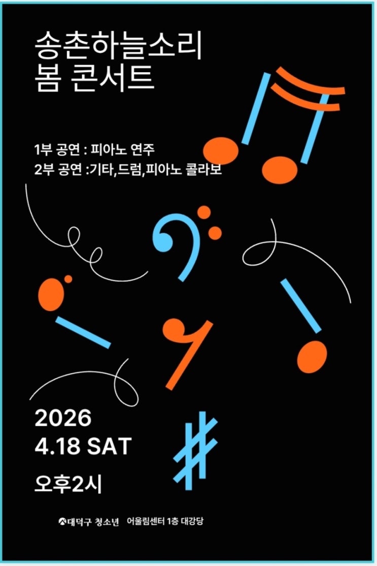 송촌하늘소리 봄 콘서트♡ 1부 피아노연주 2부 통기타, 일렉, 베이스, 드럼 ,피아노 연주 저희 학원만의 시그니쳐 클래식&실용음악으로 준비했습니다♡ 소중한 시간 내주신 부모님들과 관객분들께 깊은 감사 드립니다♡ #피아노#송촌동 음악학원#송촌초등학교 #대전송촌중학교 #송촌고등학교 #피아노입시 #통기타 #베이스기타 #일렉기타 #대전매봉중학교 #대전법동중학교 #드럼취미반 <img src="https://blogthumb.pstatic.net/MjAyNjA0MjFfMTU1/MDAxNzc2NzQ4OTU0NTUx.V0XedhZBk-31m5IEd0D7am119TPDxzyhrL_vNWsJhAgg.Wk5zLqQBu2Qc8EbSExYqsgfAtuGelmiW6pR3gj2DA70g.JPEG/900_Screenshot_20260409_140940.jpg?type=s3" />