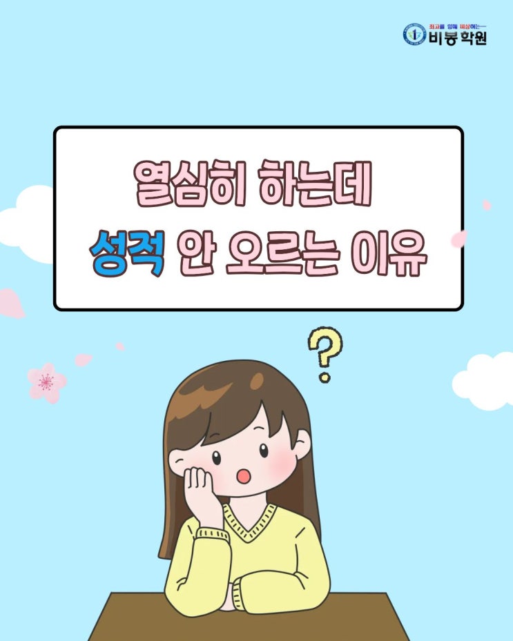 성적이 왜 오르지 않을까요? 공부는 하는데 성적이 그대로예요, 시간은 많이 쓰는데 결과가 안 나와요. 이 말들에는 공통적인 원인이 있습니다. 바로 공부 ‘시간’이 아니라 ‘방법’의 문제입니다. 전과목에 적용되는 성적 상승의 핵심 방법을 비봉학원이 알려드리겠습니다 성적은 시간보다 ‘방법’이 결정합니다 많은 학생들이 착각합니다. “오래 앉아 있으면 성적이 오른다” 하지만 실제로는 그렇지 않습니다. ✔ 하루 4시간 공부해도 성적이 그대로인 학생 ✔ 하루 2시간 공부해도 성적이 오르는 학생 이 차이는 단 하나입니다. 어떻게 공부하느냐 성적이 빠르게 오르는 학생들은 공통적으로 아래 3가지를 정확하게....... <img src="https://blogthumb.pstatic.net/MjAyNjA0MDdfMjU3/MDAxNzc1NTQ2NjQyMjM2.JbtAYz2DFkgpDb1UnLye022TXD0GXWYyjjv725r9dDEg.tbWKr6kxq34u6DK0HfbU-woiKxBbetNNpiHqI9k27agg.JPEG/KakaoTalk_20260326_163924199_01.jpg?type=s3" />