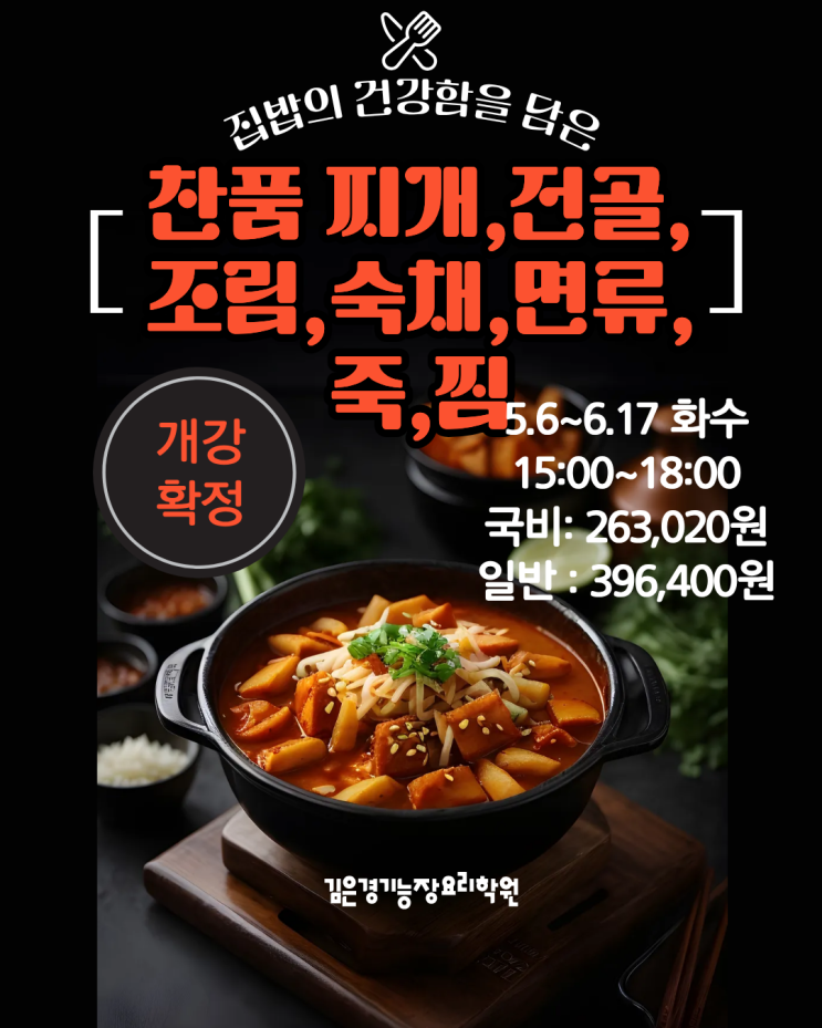 집밥의 건강함을 담은 한식 실무 과정 개강! 요즘 가장 많이 듣는 말, “집밥 제대로 배우고 싶어요” 그래서 준비했습니다. 단순 레시피가 아닌 ✔️ 실제 생활에서 활용 가능한 ✔️ 균형 잡힌 한식 메뉴 구성 ✔️ 조리 원리까지 배우는 실무 과정 ✔️원장직강! 다양한 요리 응용 Tip 전수 이런 분들께 추천합니다 ✔ 요리 초보지만 제대로 배우고 싶은 분 ✔ 집밥 메뉴를 다양하게 만들고 싶은 분 ✔ 건강식, 한식 기초를 탄탄히 하고 싶은 분 ✔ 취미 + 실력 동시에 잡고 싶은 분 ✔퇴직 후 요리를 제대로 배우고 싶은 분 배우는 메뉴 구성 ✔ 찌개 / 전골 ✔ 조림 / 숙채 ✔ 면류 / 죽 ✔ 찜 / 반찬 구성 “집에....... <img src="https://blogthumb.pstatic.net/MjAyNjA0MjFfMTQ4/MDAxNzc2NzgwNDk2NjIz._wme8Iby0rHjZJ_MalK4TvIfYp7AOwkPq4iJwP-nL1sg.9TnybH8SjQnjJSxs1H-ykW_EATRSLLhfiZTTwKHLiG0g.PNG/%C1%A6%B8%F1%C0%BB_%C0%D4%B7%C2%C7%D8%C1%D6%BC%BC%BF%E4._%2860%29.png?type=s3" />