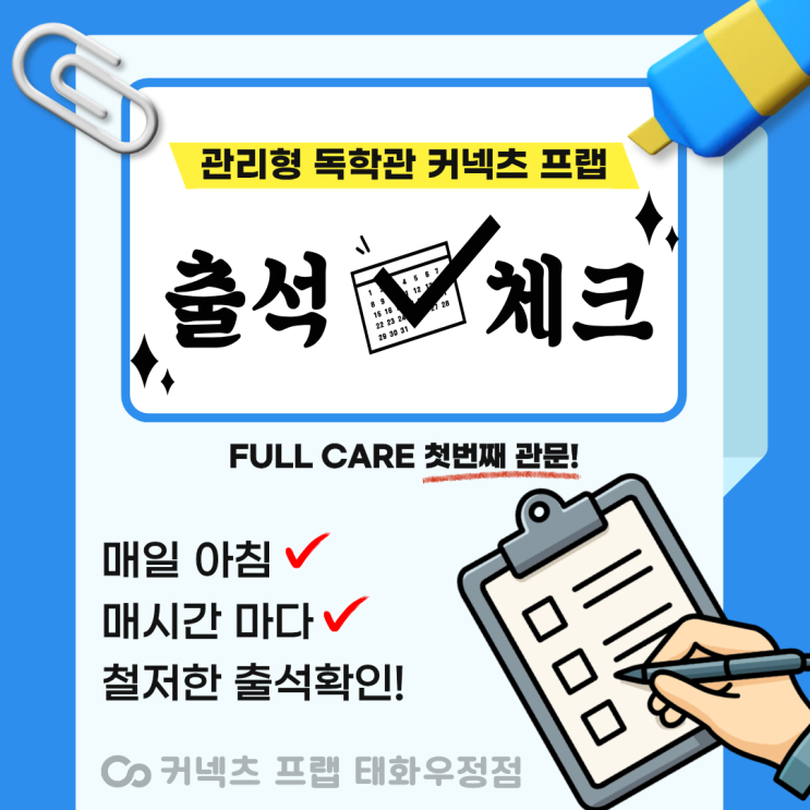 안녕하세요 커넥츠 프랩 태화우정점 입니다. 관리형 독학관의 기본중의 기본 관리! 철저한 출석확인 출입문을 통과함과 동시에 출석체크를 하도록 되어 있습니다! 출석은 매일아침 출석을 확인하고 지각생이 확인되거나, 무단 결석을 하는 경우에는 각 학생에게 연락을 취하고 등원여부와, 사유 등을 확인하여 학습계획에 차질이 생기지 않도록 관리 하고 있습니다. 1교시 부터 6교시까지 매 시간마다 다시 한번 출석 확인을 하게 됩니다. 쉬는시간 이후 학습시간이 되어 제자리에 착석을 했는지 혹여 쪽잠을 자다가 못 일어난 학생이 있는지도 다시 한번 확인 합니다. 출석을 했다면 자연스럽게 휴대폰은 지정공간에 반납을 하고 학습실에 착석....... <img src="https://blogthumb.pstatic.net/MjAyNjA0MjFfMTIy/MDAxNzc2NzUyMzYwNTk2.yy98ddkJH3mg_QdRnDJja0xBFQq8qWD40rkUKJuAmLQg.Y4GqkHPBkFeewYNn-8kJ3iiSgjEMdB4ePSNENWAoMqsg.PNG/%C1%A6%B8%F1%C0%BB_%C0%D4%B7%C2%C7%D8%C1%D6%BC%BC%BF%E4.-_%BA%B9%BB%E7%BA%BB_%2815%29.png?type=s3" />