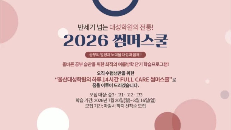 울산 썸머스쿨 중3, 고1, 고2, 고3 학생들을 위한 울산대성학원 2026 여름방학 프로젝트가 2026년 7월 20일 월요일부터 시작하게 되어, 현재 울산대성학원에서는 여름방학 기간 운영되는 썸머스쿨 사전 모집을 하고 있는데, 이번 포스트에서는 이런 울산대성학원 썸머스쿨 및 사전 모집 등에 대해서 안내를 드리도록 할게요...^^ 반세기 넘는 대성학원의 전통! 2026 울산대성학원 썸머스쿨 공부의 노력과 열정을 대성과 함께!! 우리 수험생들만을 위한 하루 14시간 풀 케어 썸머스쿨로 성적 향상의 꿈을 이루어드리겠습니다. 01. 모집 대상 : 중3, 고1, 고2, 고3 02. 운영 기간 : 2026년 7월 20일 월요일 ~ 8월 16일 일요일 03. 모집 기간 : ~ 마....... <img src="https://phinf.pstatic.net/image.nmv/blog_2026_04_30_972/DKyAxTCqoe_01.jpg?type=f480x480" />