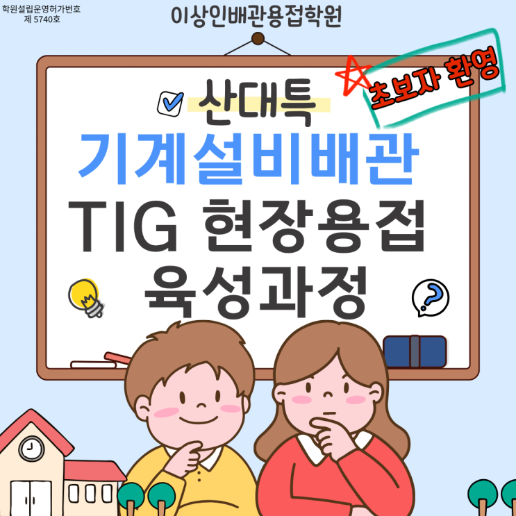 안녕하세요. 울산용접학원 이상인배관용접학원입니다. 용접을 한 번 배워볼까 고민이신 분! 용접사로 취업을 고민하시는 분! 용접 기량을 높여서 이직을 원하시는 분! 현장용접을 배워 보실 수 있는 6월 산대특 과정을 소개해드립니다! 배관용접사 취업을 위한 실무 교육과정! 초보자도 시작할 수 있는 1:1 맞춤교육으로 진행되는 수업으로 실제 취업에 필요한 역량을 갖출 수 있도록 단순한 이론교육이 아닌 현장에서 바로 활용 가능한 실무능력을 키우는 데 초첨을 맞추고 있습니다! 배관용접사 기량테스트 준비 및 실무용접을 한 번에! 과정명 : 기계설비 배관 TIG 현장용접 육성과정 교육기간 : 2026년 6월 1일 ~ 2026년 10월 26일 (총 110일....... <img src="https://blogthumb.pstatic.net/MjAyNjA0MTRfMTU1/MDAxNzc2MTM2MDQ4MjQ4.w2dv_MAMu-_TgPOStuPeNTl4jJvoauLHrXbY8zM4CQUg.hVaaVoOBRo0SFSsgtzh43QJKEBCkCq1dUxXjP8u47dsg.PNG/1.png?type=s3" />