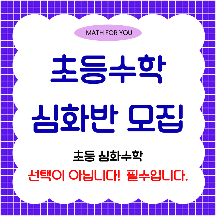 안녕하세요? 차원이 다른 수학 무거동장검굴화초등수학학원 매쓰포유입니다. 많은 학부모님께서 중학교 성적표의 'A'를 보고 안심하시지만, 안타깝게도 고등학교 진학 후 무너지는 아이들을 수없이 목격하곤 합니다. 무엇보다 초등 시절, 단순히 연산을 빨리하거나, 공식만을 외워 문제를 푸는 데 그쳤기 때문입니다. 진짜 실력은 '한 번도 경험해본 적 없는 어려운 문제'를 스스로 끝까지 붙들고 해결하는 힘에서 나옵니다. 저희 매쓰포유 수학전문학원에서는 명문대와 의대를 향한 첫 단추, [초등 심화수학] 모집 소식을 전해드립니다. 선택이 아닌 필수! 왜 초등 시기에 '심화'와 '경시를 반드시 경험해야....... <img src="https://blogthumb.pstatic.net/MjAyNjA0MTdfMTMy/MDAxNzc2NDE3MjMzOTMy.QHNVE4DYqYfKsrjLij2dVm2KqUy_GfZJAvBcbQ7-BKIg.mkPT74ME8ifAzRLtc7CDOia_rZuBFlgb5Rb11XIr8xYg.PNG/%C3%CA%B5%EE%BD%C9%C8%AD%BC%F6%C7%D0.png?type=s3" />