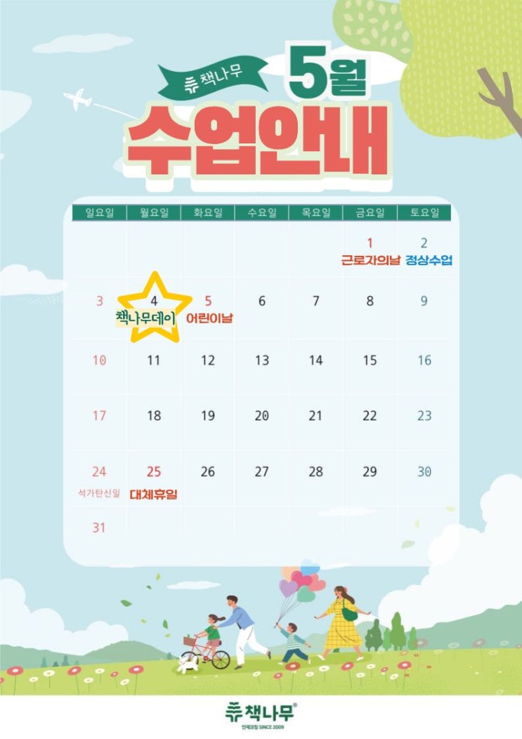 안녕하세요! 우리 아이들의 생각이 쑥쑥 자라나는 공간, 책나무 무거초점입니다. 따스한 햇살과 함께 어느덧 가정의 달 5월이 다가오고 있습니다. 5월은 어린이날을 비롯해 가족과 함께하는 소중한 날들이 참 많은데요. 우리 아이들이 가족과 충분히 충전하는 시간을 가질 수 있도록 5월 휴원 일정과, 아이들이 손꼽아 기다리는 책나무데이(마켓데이) 소식을 전해드립니다. 1. 5월 휴원 일정 안내 학부모님께서는 아래 일정을 확인하시어 아이들의 등원 스케줄에 참고해 주시기 바랍니다. 5월 1일 (금) : 근로자의 날 (휴원) 5월 25일 (월) : 석가탄신일 대체공휴일 (휴원) 보강 안내 위 휴원일로 인해 빠지는 수업은 아이들의 학....... <img src="https://blogthumb.pstatic.net/MjAyNjA0MjBfMjY2/MDAxNzc2NjYzOTEzMzA1.eJHhCDNCZoQs06TQ4WpMVQ067EjJ2TBOIC1d9SSnTFMg.TvumDZLQGqjiI9gphMN8RO2VWBFFMoA4gFQCDnzE2ugg.JPEG/%C1%A6%B8%F1%C0%BB_%C0%D4%B7%C2%C7%D8%C1%D6%BC%BC%BF%E4._%281%29.jpg?type=s3" />