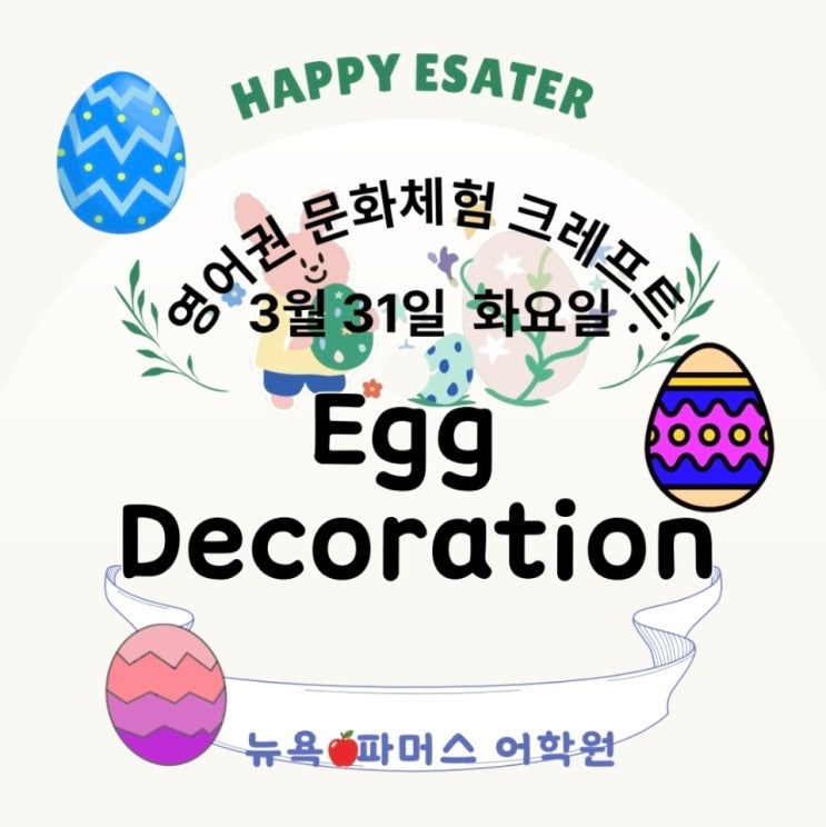 [제목] 영어권 문화체험 2026: 4월 부활절(Easter) 행사, 단순한 놀이 그 이상입니다! 안녕하세요! 아이들의 꿈이 건강하게 자라는 공간, 뉴욕애플 파머스 어학원입니다. 어느덧 만개한 봄꽃들과 함께 4월이 찾아왔습니다. 저희 학원에서는 이번 부활절을 맞아 아이들과 함께 아주 특별한 'Easter Celebration' 시간을 가졌는데요. 오늘은 아이들과 함께한 생생한 현장과 함께, 영어학원에서 왜 이런 문화 체험이 필수적인지 그 이유를 들려드리려 합니다. 부활절(Easter), 어떤 의미를 담고 있나요? 행사를 시작하며 아이들에게 부활절의 유래를 먼저 들려주었습니다. **부활절(Easter)**은 서구권에서 크리스마스만큼이나....... <img src="https://blogthumb.pstatic.net/MjAyNjA0MTRfMjMz/MDAxNzc2MTQ3ODUzOTY0.O3QTobFUb0_hLSt0VsOlUB8r4yJvlZnK_cRTwbr8P0Ig.HFgm0gJ0FE-C4ixy4fB0IVvoQjxqJ5jfYSv4_TCS2JIg.JPEG/easter_1.jpg?type=s3" />