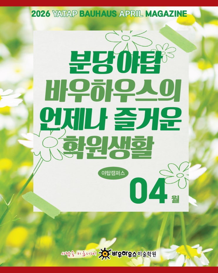 안녕하세요! 분당 야탑 바우하우스 미술 학원입니다 완연한 봄기운 속에 야탑 바우하우스 학생들은 새 학기의 설렘을 기분 좋은 몰입으로 바꿔가고 있습니다 싱그러운 4월의 에너지를 가득 담은 야탑 바우하우스 2026년 4월 소식지를 전해드립니다!☘️ 분당 야탑 바우하우스의 즐거운 학원생활 전임 강사 연구작 품평회와 시범 수업 새 학기의 시작도 무색하게 어느덧 새로운 환경에 금방 적응해서 그림에 열중하는 우리 학생들 모습이에요. 야탑 바우하우스 교실은 전임 강사 선생님들의 연구작 품평회와 시범 수업으로 그 어느 때보다 열기가 가득한데요 바로 눈앞에서 펼쳐지는 선생님들의 생생한 시범을 하나라도 더....... <img src="https://blogthumb.pstatic.net/MjAyNjA0MTdfMjU2/MDAxNzc2NDE0NjUzNTk5.alErzDPaeMGhSzeF3xRK6QYp_ShQjqM-eb4beMBY62Eg.PkN19z_xhfhK8nMvWipjwEbjDth5RsSCB1iBiblqemUg.JPEG/%BE%DF%C5%BE%BC%D2%BD%C4%C1%F60.jpg?type=s3" />