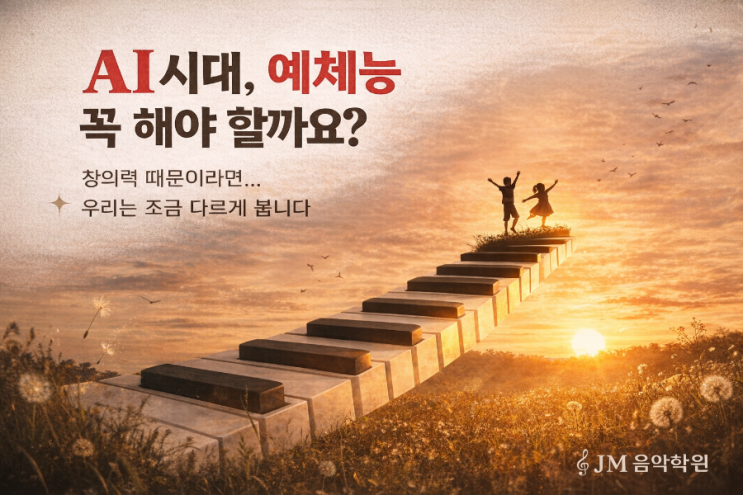 예체능은 창의력을 만드는 교육이 아니라 아이를 ‘사람답게’ 성장시키는 교육입니다. AI 시대, 왜 예체능 교육일까요? 요즘 가장 많이 듣는 말이 있습니다. “AI 시대니까 창의력이 중요해요.” “그래서 예체능을 해야 해요.” 그런데 한 번 생각해볼 필요가 있습니다. 정말 창의력 = 예체능 이 공식이 맞을까요? ❓ 우리는 조금 다르게 봅니다 예체능의 가치는 단순히 “잘하는 능력”에 있지 않습니다. ✔ 그림을 잘 그리는 것 ✔ 악기를 잘 연주하는 것 이건 결과일 뿐입니다. 예체능의 본질 예체능의 진짜 의미는 느끼고 표현하는 경험입니다. 아이들은 음악을 배우며 단순히 손가락을 움직이는 것이 아니....... <img src="https://blogthumb.pstatic.net/MjAyNjA0MThfODYg/MDAxNzc2NDgzNDYxOTY1.INOqQkTNz_zqbmzbXUJ8n-JfknDY8U0yx2iHzxXjQwUg.D5iUnkyv9Ht0YhzSeI92YC2ouEhtypQwaQwXIurKTFMg.PNG/900_file_00000000d9587207b3ddb84bfd62e849.png?type=s3" />